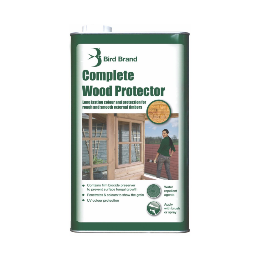 Bird Brand Complete Wood Protector is a long lasting colour and protection for rough and smooth external timbers. This product contains water repellent agents and film biocide preservers to prevent surface fungal growth. Solvent based and ready to use product which uses hydrophobic waxes to prevent decay and damage that water ingress can cause. Also contains UV resisting pigments so your wood stays in top condition throughout the seasons. Ideal treatment which decorates protects: sheds, fences, decking, planters and any timber surface. The dry film biocide ingredients within Complete Wood protector help protect the finish against fungal growth and discolouration.
