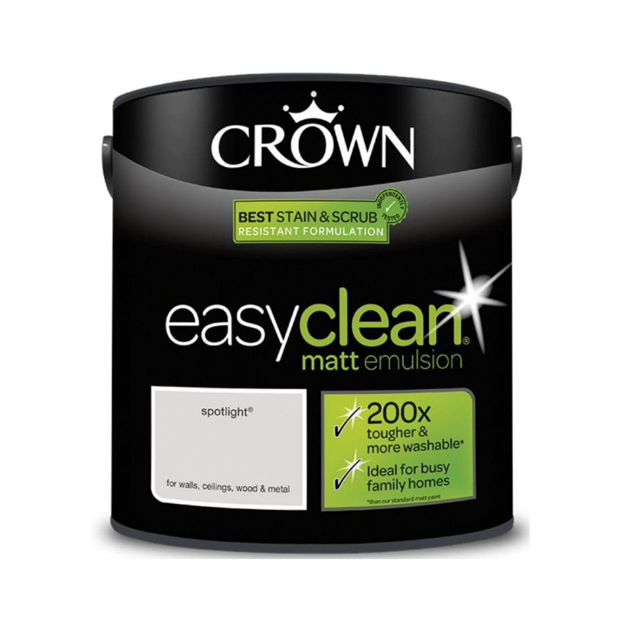 The Crown Easyclean Matt Emulsion is made for busy homes. 200 times tougher than Crown’s standard Matt Paint makes it ideal for repetitive cleaning, bumps and scuffs. Easyclean keeps walls, ceilings, wood and metal looking fresh for longer. Colours co-ordinate with Crown Matt and Silk Emulsion, a great choice for stunning feature walls and details. Crown’s toughest and most washable range has a simple, on trend, no shine matt finish with a rich and creamy colour. Breatheasy formula that is 99% solvent free, so paint jobs are safer. Independently tested* against our main competitor products and is shown to be the best for stain and scrub resistance, toughness and washability. Easyclean keeps walls, ceilings, wood and metal looking cleaner for longer, making it perfect for busy family homes