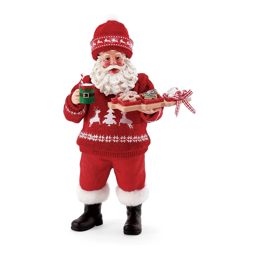 Santa isn’t coming empty handed this year, he’s ready for the holidays with his tray of appetizers. He is out of his iconic suit and dressed in his Santa lounge wear. This piece is free standing so can be displayed either by himself or with others to create a festive scene.