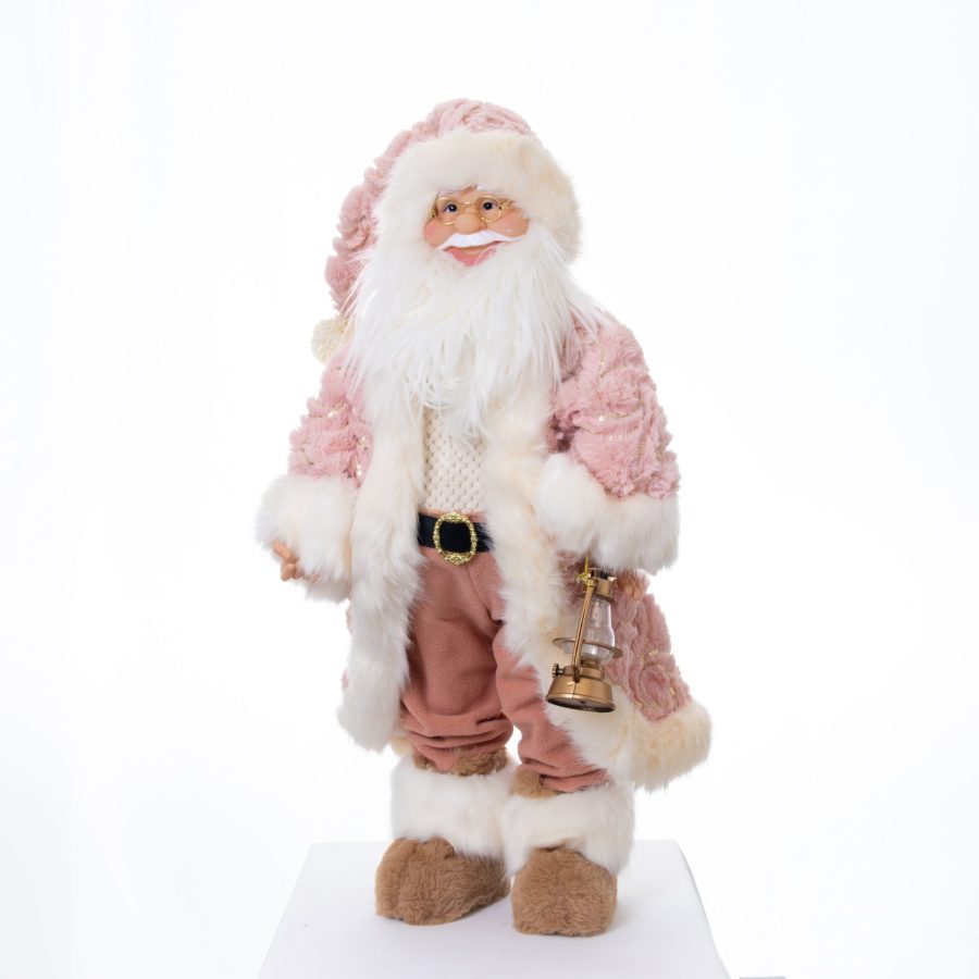 A luxury festive Santa ornament in stunning pink fabrics. A unique decoration allowing you to customise your own Christmas colours or match Santa to your home! Wherever you place him, his sequin patterned fur coat will add sparkle over the winter period. Not a detail missed this Santa is complete with gold-rimmed glasses, lantern and sparkling buckle.