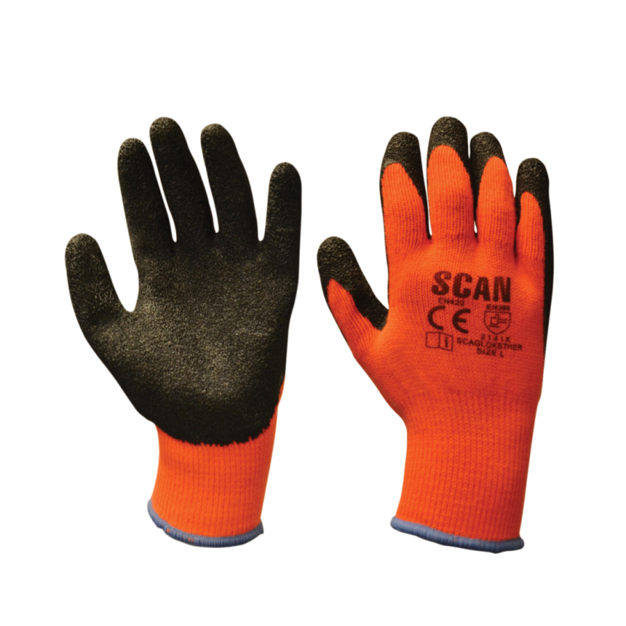 Scan Orange/Black Knitshell Thermal Gloves are high-visibility gloves with black latex wrinkle finish coating to the palm and fingers, giving excellent grip in both wet and dry conditions. Ideal for the construction, automotive and handling industries – and perfect for keeping warm in colder weather!
